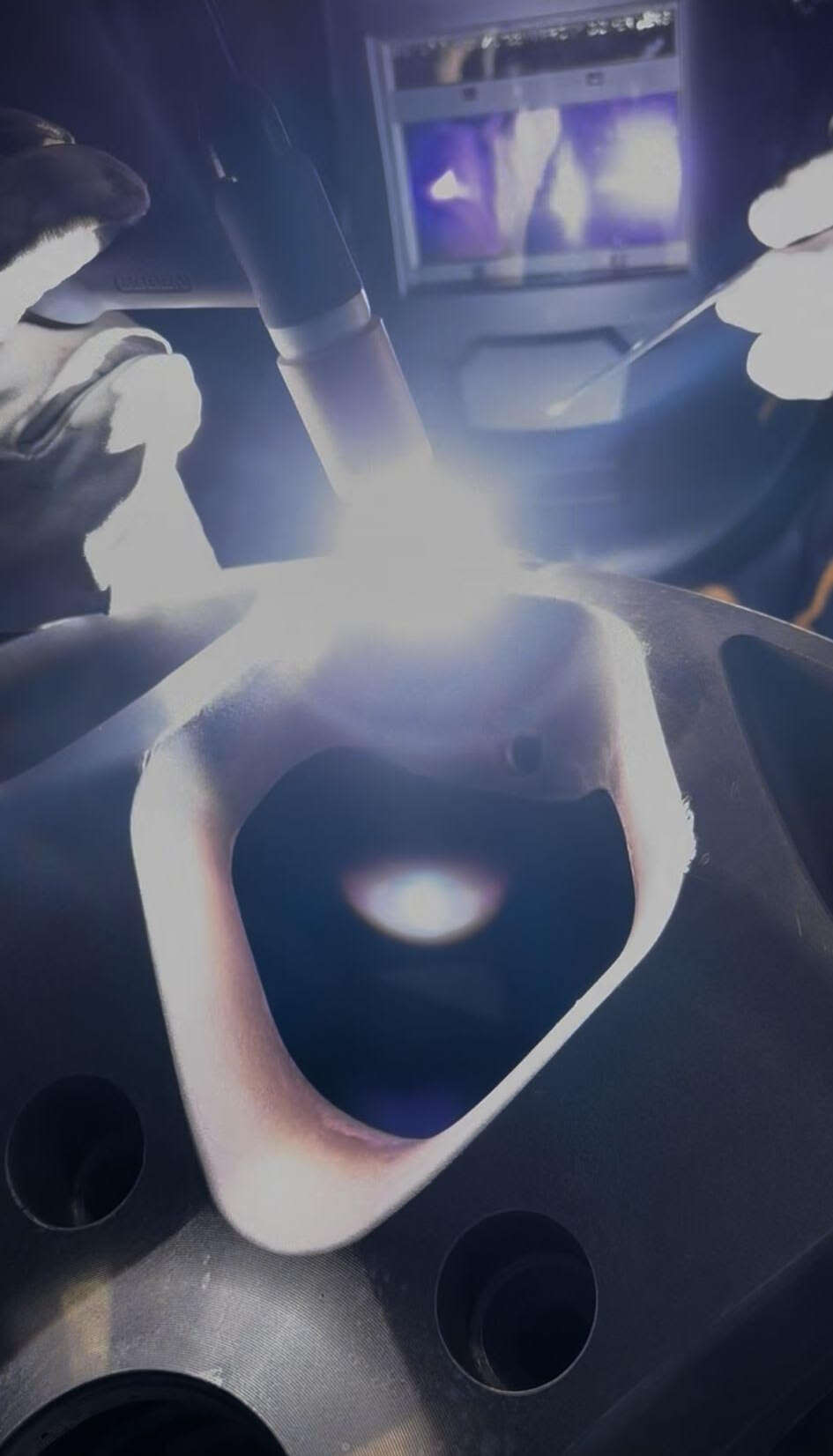 The now perfectly prepped area will be TIG welded. The outside of the barrel is ground back so the tyre can seal, the weld on the inside of the barrel is left proud to ensure increased strength.